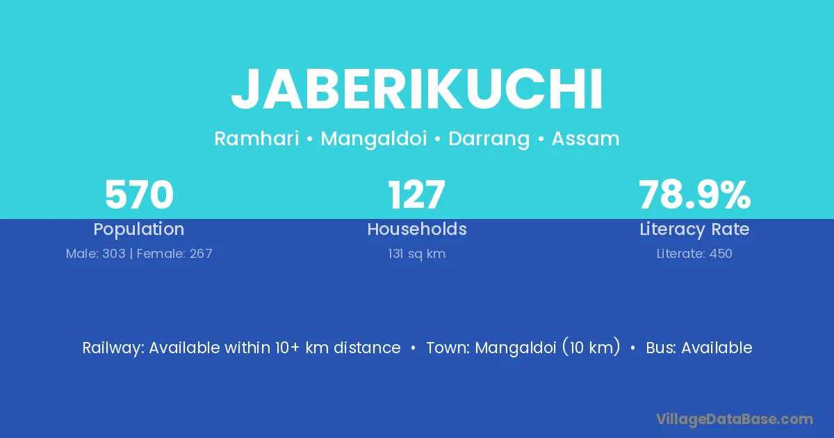 Mangaldoi (10 km) is the nearest town to Jaberikuchi village for major economic activities and is located approximately 10 km away.
