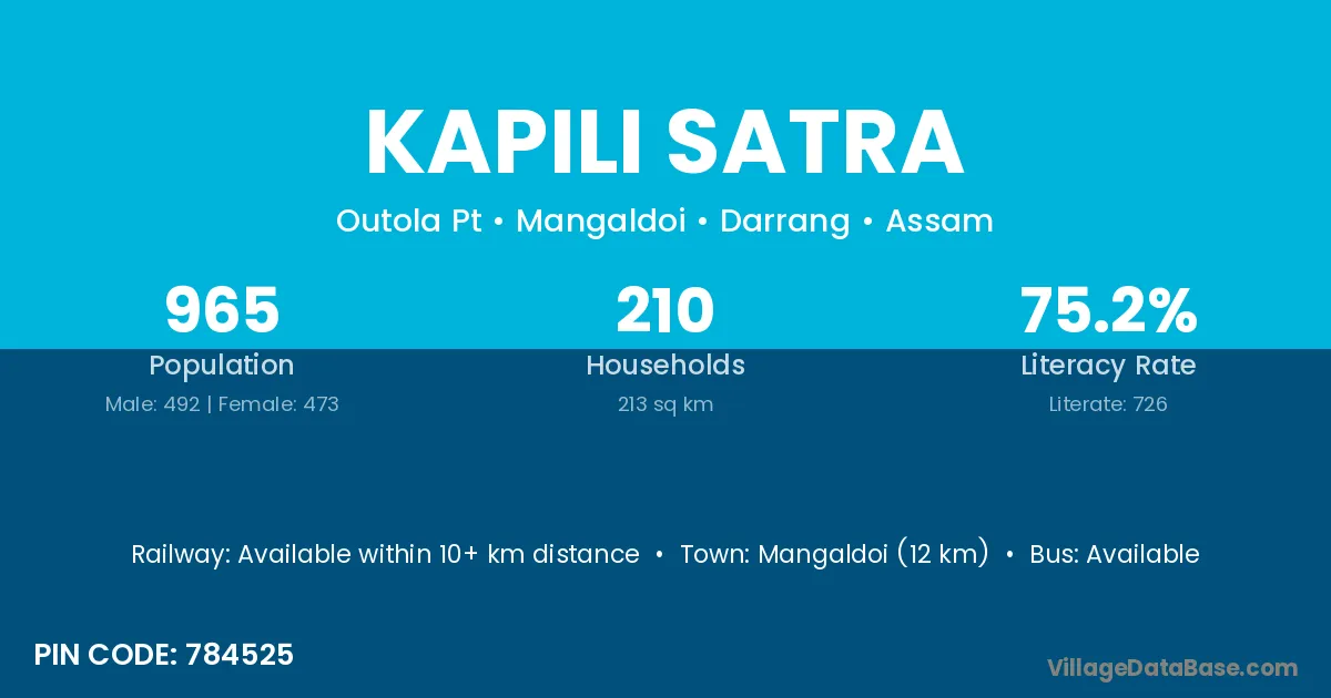 Kapili Satra village has a total population of 965 people, of which 492 are males and 473 are females.