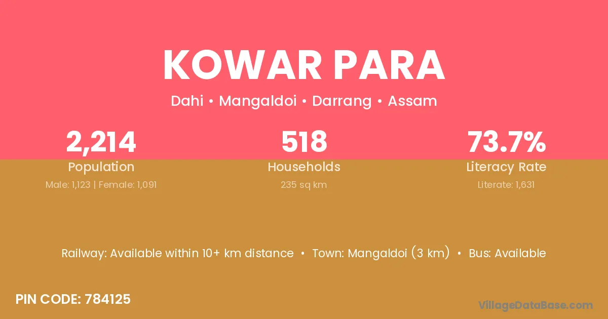 Mangaldoi (3 km) is the nearest town to Kowar Para village for major economic activities and is located approximately 3 km away.