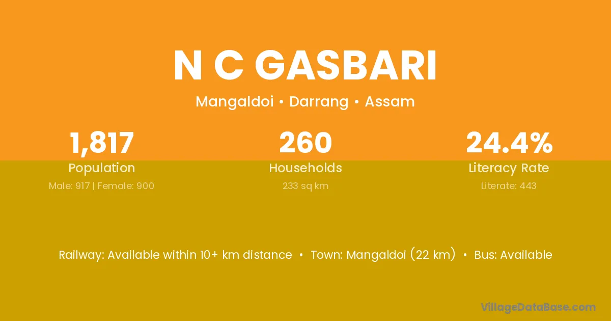 Mangaldoi (22 km) is the nearest town to N C Gasbari village for major economic activities and is located approximately 22 km away.