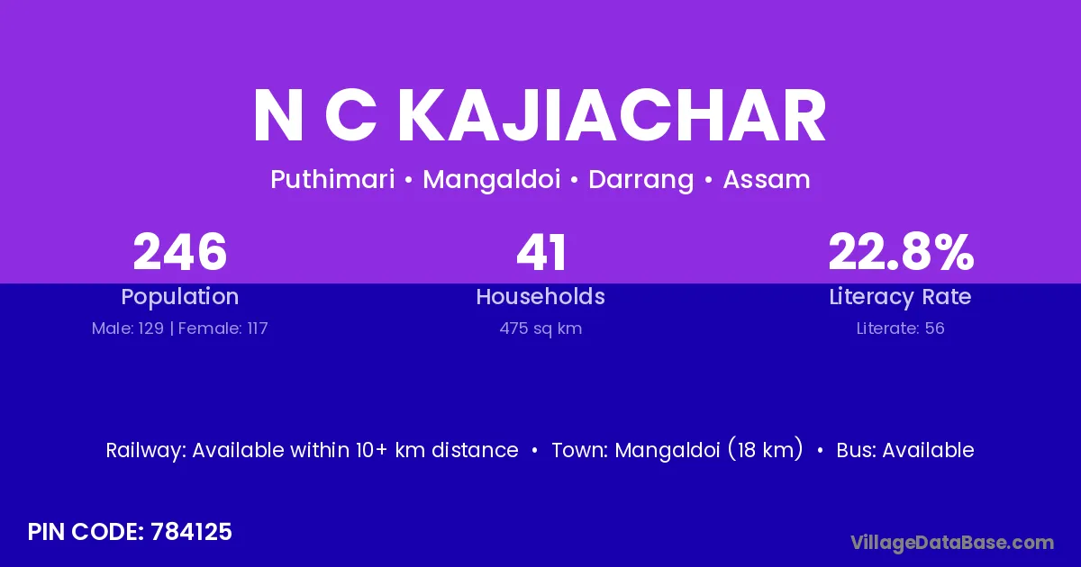Mangaldoi (18 km) is the nearest town to N C Kajiachar village for major economic activities and is located approximately 18 km away.