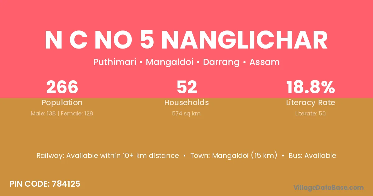 Mangaldoi (15 km) is the nearest town to N C No 5 Nanglichar village for major economic activities and is located approximately 15 km away.