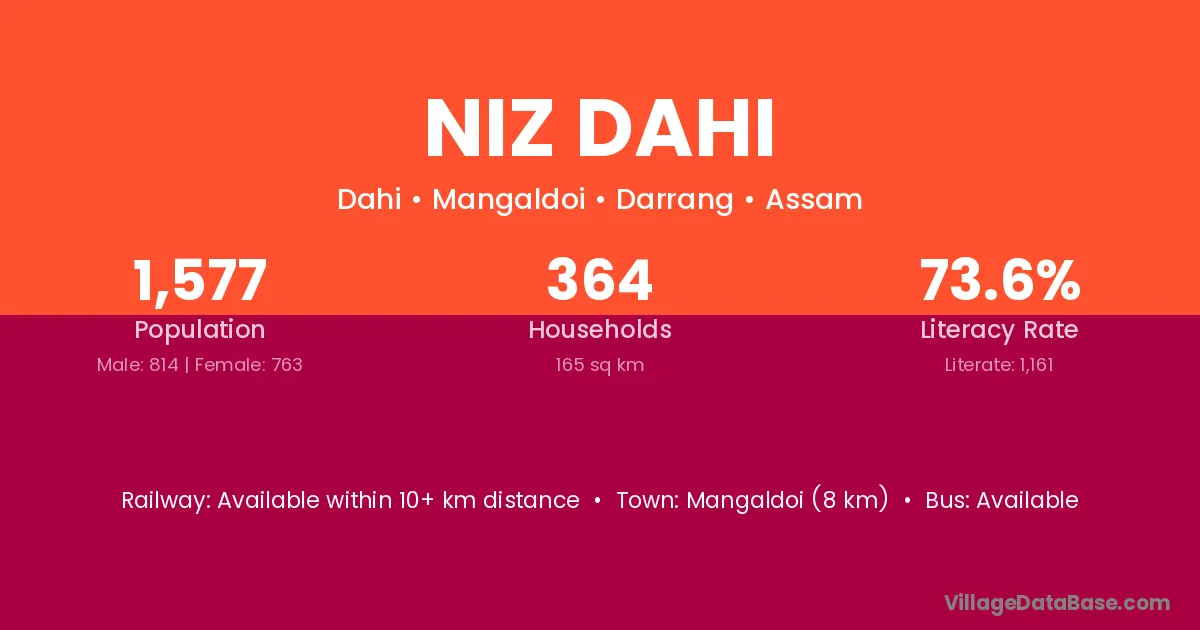 Mangaldoi (8 km) is the nearest town to Niz Dahi village for major economic activities and is located approximately 8 km away.