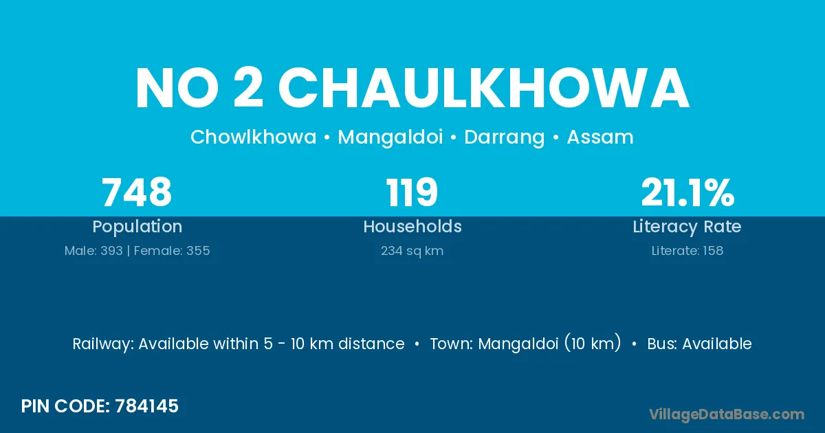 Mangaldoi (10 km) is the nearest town to No 2 Chaulkhowa village for major economic activities and is located approximately 10 km away.