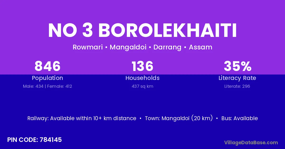 No 3 Borolekhaiti village has a total population of 846 people, of which 434 are males and 412 are females.