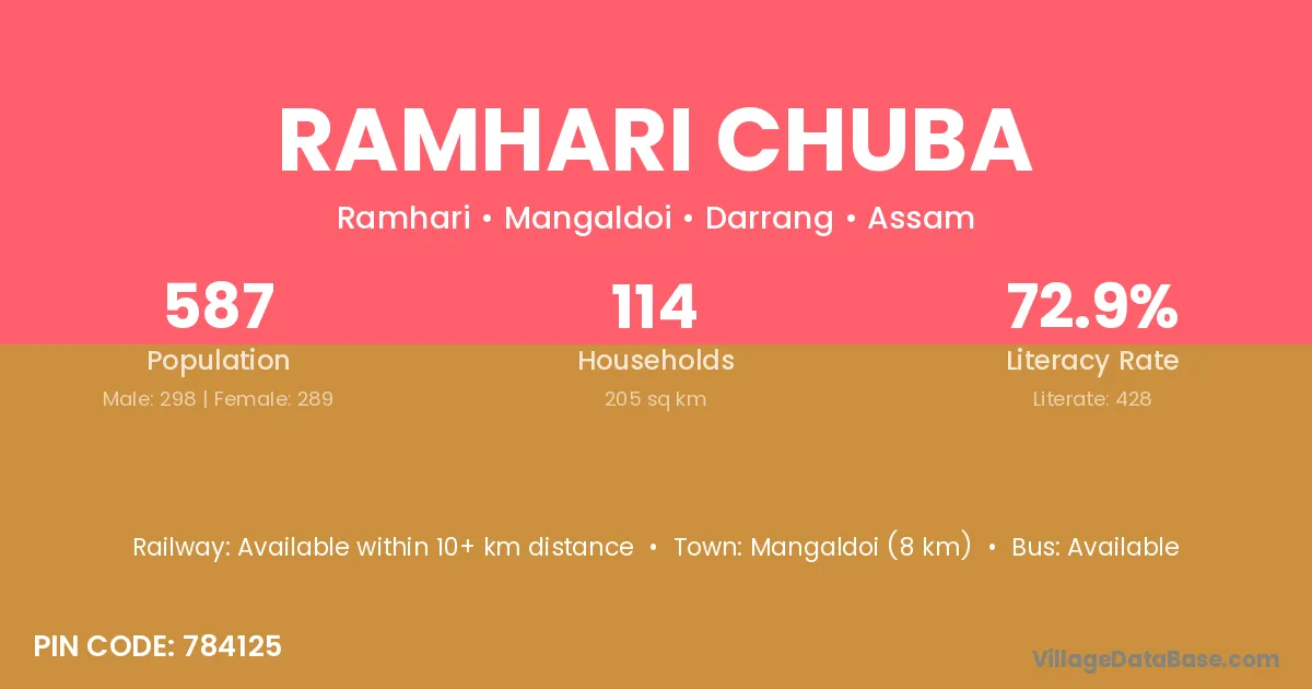 Mangaldoi (8 km) is the nearest town to Ramhari Chuba village for major economic activities and is located approximately 8 km away.