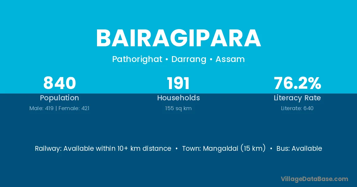 Mangaldai (15 km) is the nearest town to Bairagipara village for major economic activities and is located approximately 15 km away.