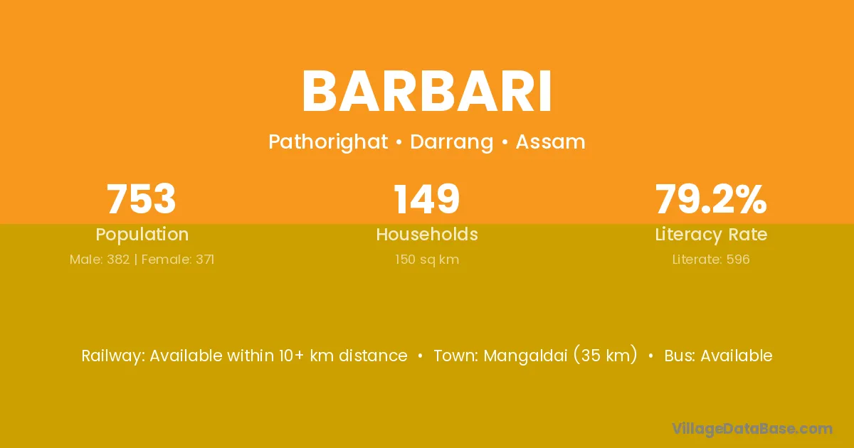 Mangaldai (35 km) is the nearest town to Barbari village for major economic activities and is located approximately 35 km away.