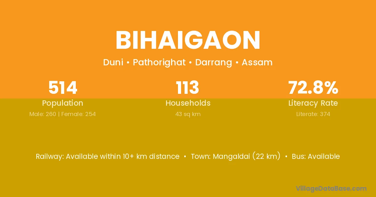 Mangaldai (22 km) is the nearest town to Bihaigaon village for major economic activities and is located approximately 22 km away.