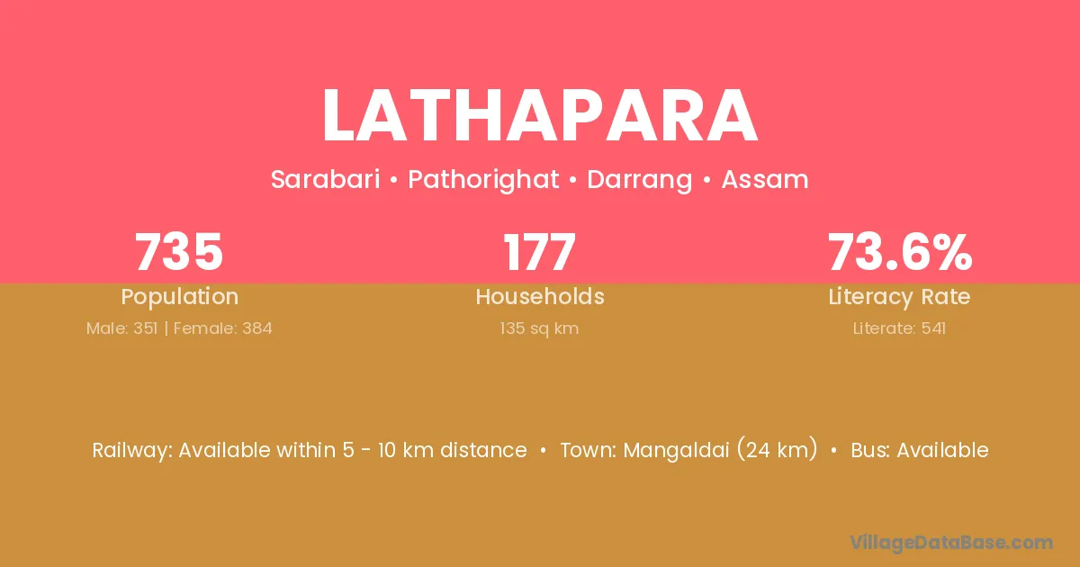 Mangaldai (24 km) is the nearest town to Lathapara village for major economic activities and is located approximately 24 km away.