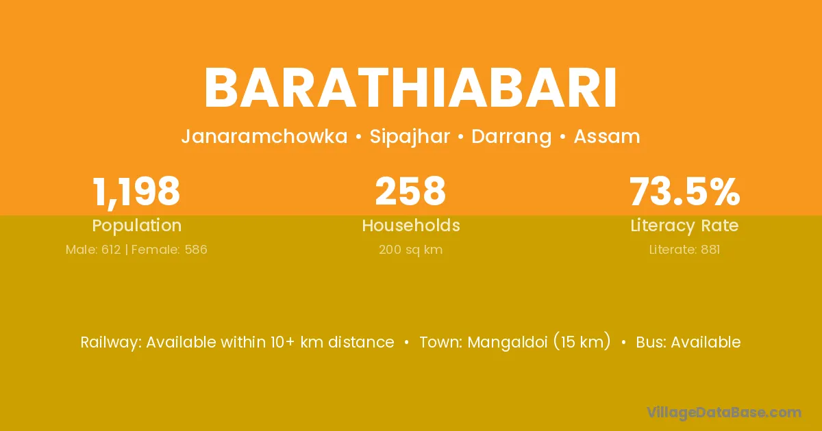Mangaldoi (15 km) is the nearest town to Barathiabari village for major economic activities and is located approximately 15 km away.