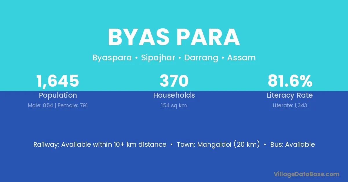Mangaldoi (20 km) is the nearest town to Byas Para village for major economic activities and is located approximately 20 km away.