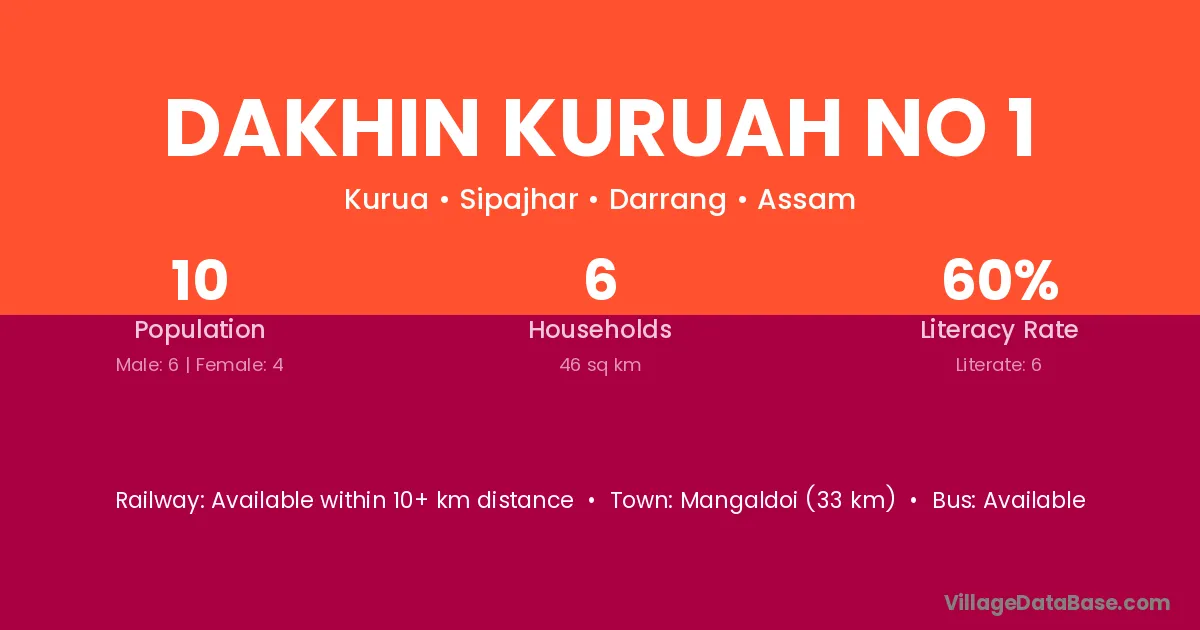 Dakhin Kuruah No 1 village has a total population of 10 people, of which 6 are males and 4 are females.