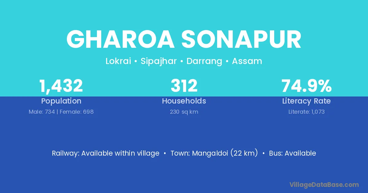 Mangaldoi (22 km) is the nearest town to Gharoa Sonapur village for major economic activities and is located approximately 22 km away.