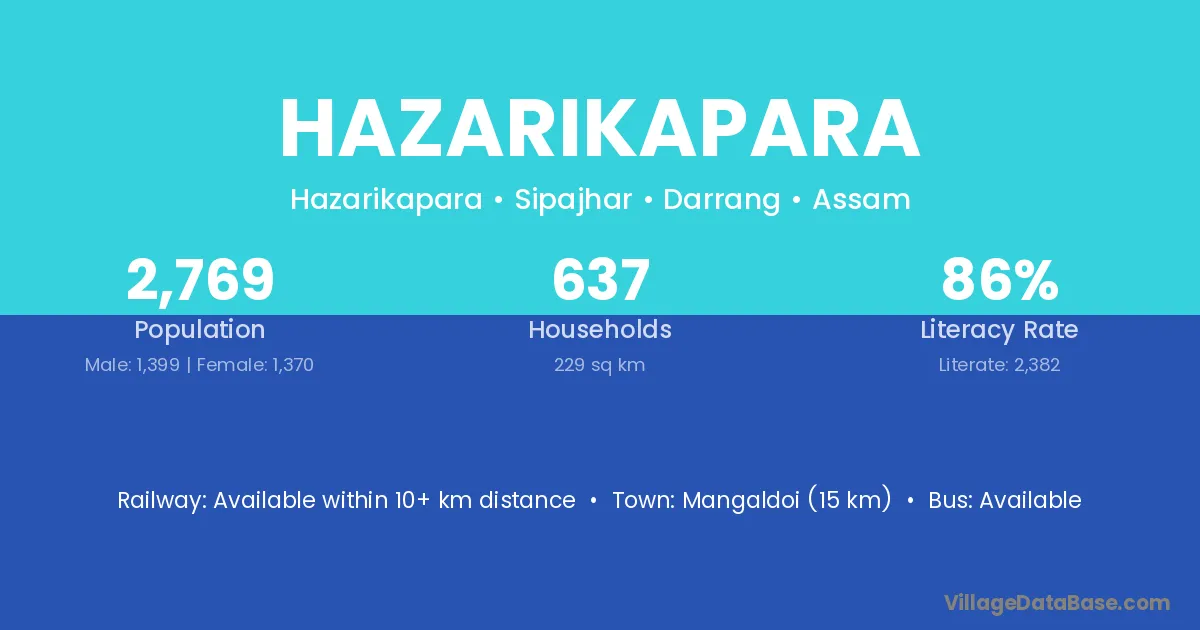 Mangaldoi (15 km) is the nearest town to Hazarikapara village for major economic activities and is located approximately 15 km away.