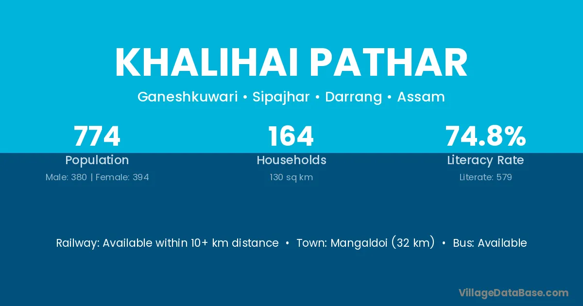 Mangaldoi (32 km) is the nearest town to Khalihai Pathar village for major economic activities and is located approximately 32 km away.