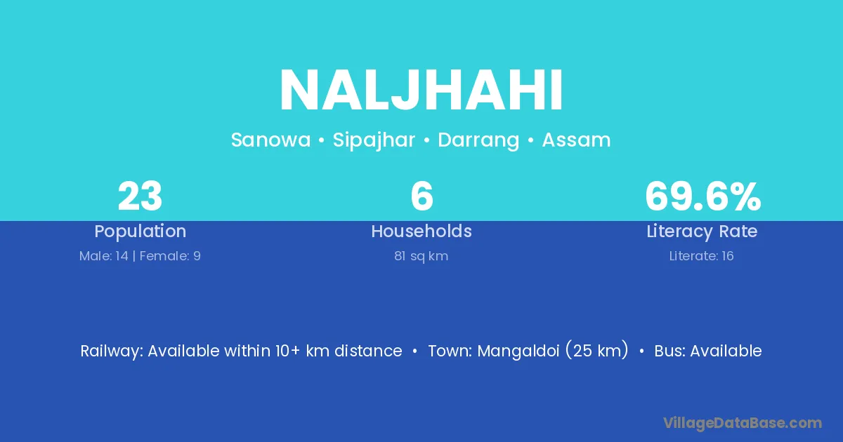 Mangaldoi (25 km) is the nearest town to Naljhahi village for major economic activities and is located approximately 25 km away.