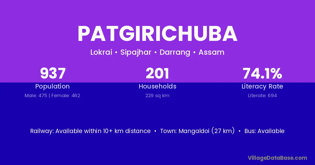 Mangaldoi (27 km) is the nearest town to Patgirichuba village for major economic activities and is located approximately 27 km away.