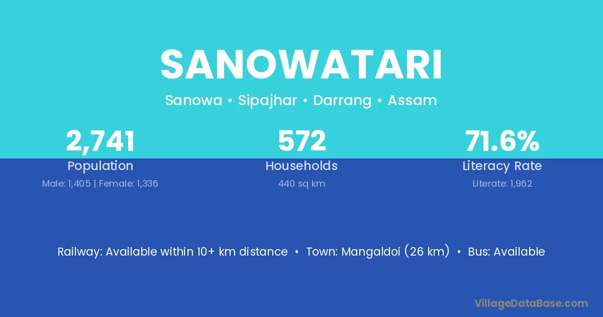 Mangaldoi (26 km) is the nearest town to Sanowatari village for major economic activities and is located approximately 26 km away.