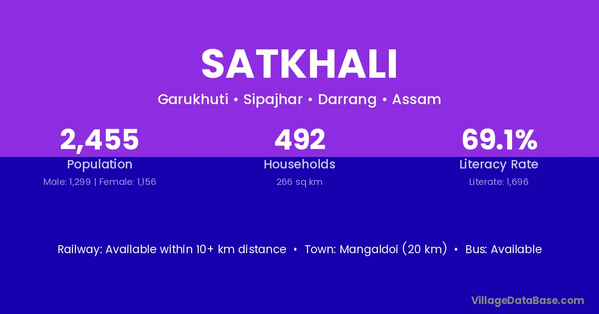 Mangaldoi (20 km) is the nearest town to Satkhali village for major economic activities and is located approximately 20 km away.
