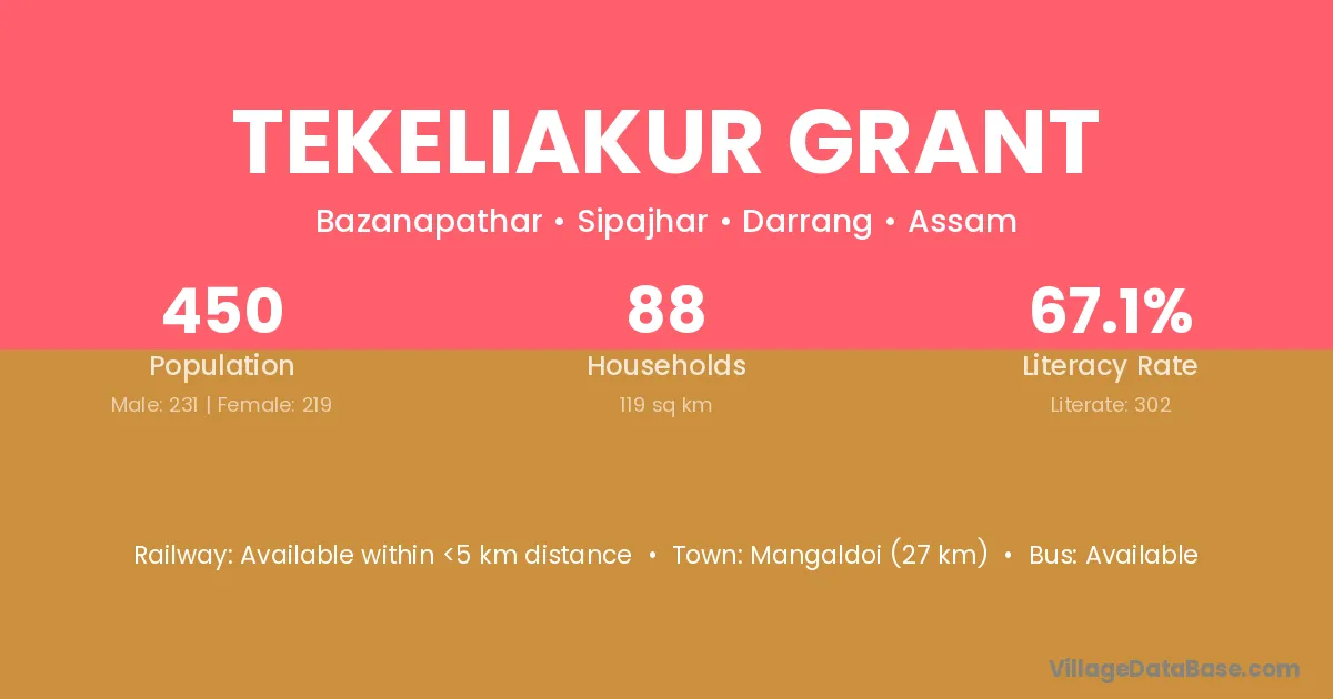 Mangaldoi (27 km) is the nearest town to Tekeliakur Grant village for major economic activities and is located approximately 27 km away.