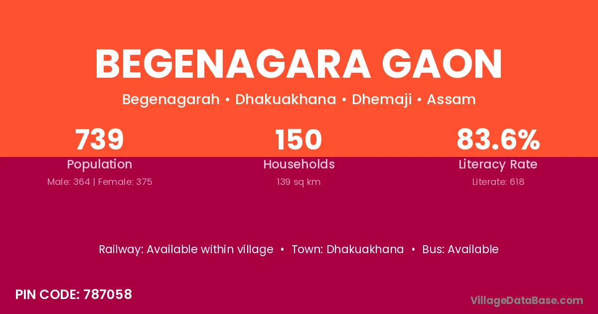 Begenagara Gaon village has a total population of 739 people, of which 364 are males and 375 are females.