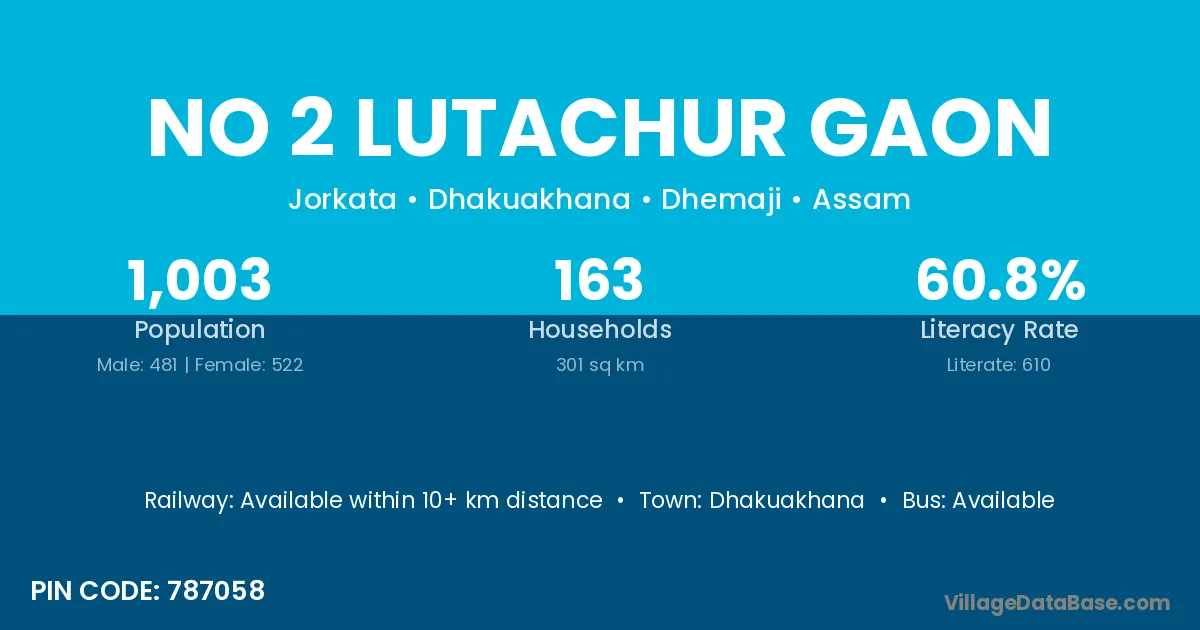 No 2 Lutachur Gaon village has a total population of 1,003 people, of which 481 are males and 522 are females.