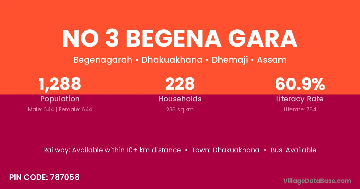 No 3 Begena Gara village has a total population of 1,288 people, of which 644 are males and 644 are females.
