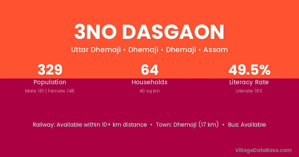 Dhemaji (17 km) is the nearest town to 3no Dasgaon village for major economic activities and is located approximately 17 km away.