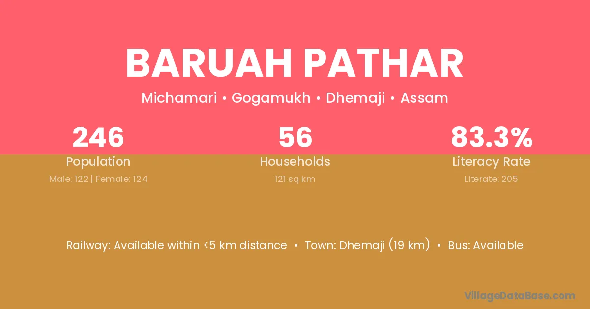 Baruah Pathar village has a total population of 246 people, of which 122 are males and 124 are females.