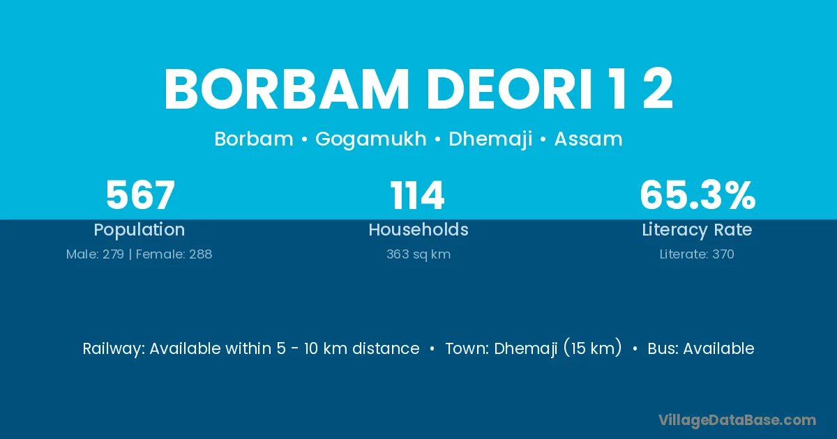 Dhemaji (15 km) is the nearest town to Borbam Deori 1 2 village for major economic activities and is located approximately 15 km away.