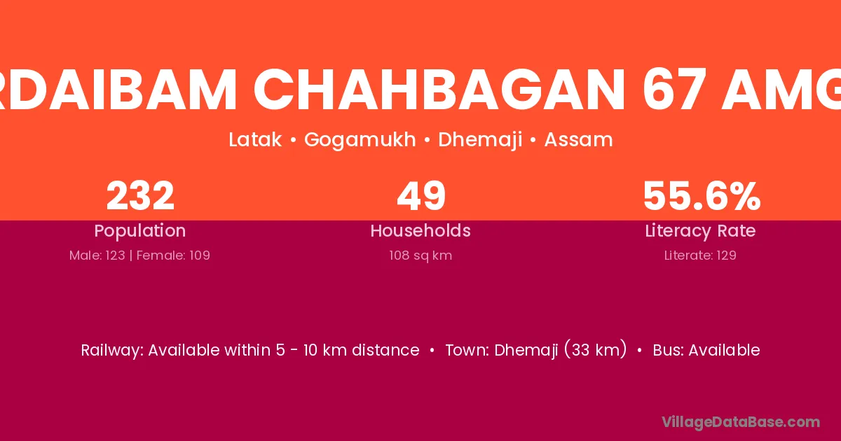 Dhemaji (33 km) is the nearest town to Bordaibam Chahbagan 67 Amguri village for major economic activities and is located approximately 33 km away.