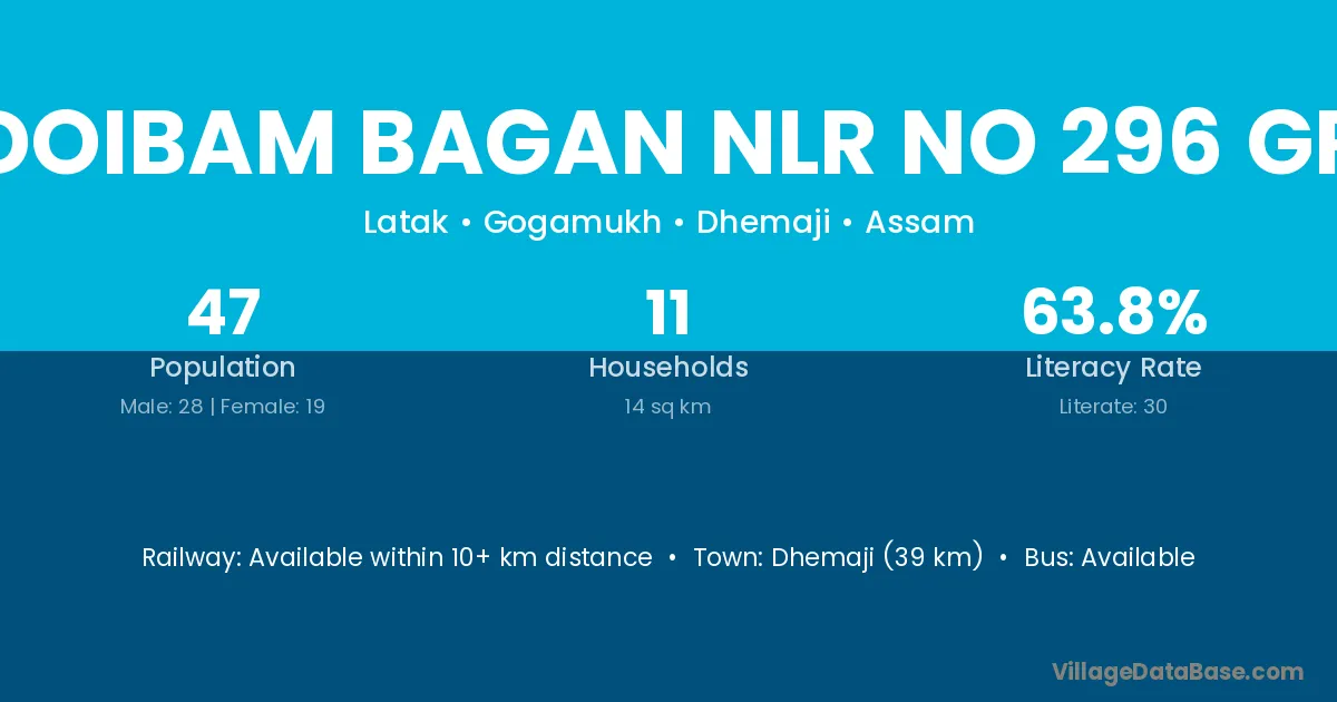 Bordoibam Bagan Nlr No 296 Grant village has a total population of 47 people, of which 28 are males and 19 are females.
