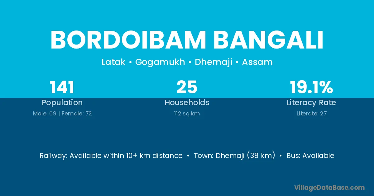 Dhemaji (38 km) is the nearest town to Bordoibam Bangali village for major economic activities and is located approximately 38 km away.