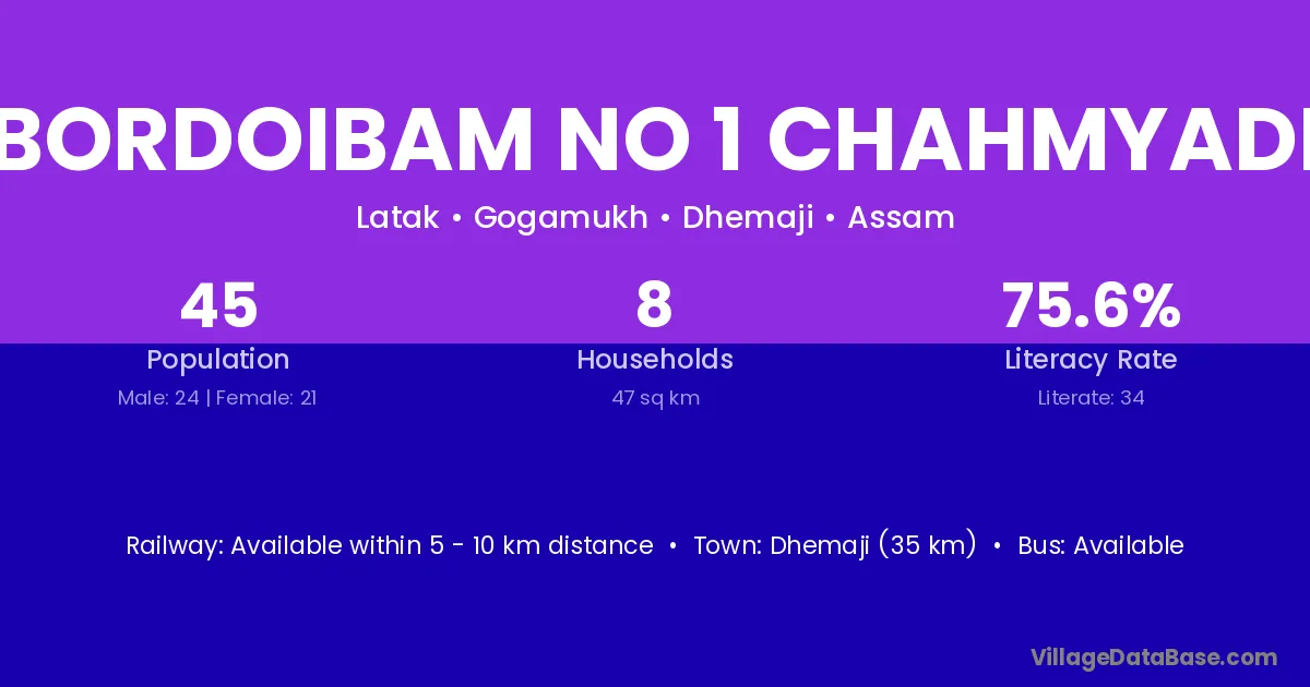 Bordoibam No 1 Chahmyadi village has a total population of 45 people, of which 24 are males and 21 are females.