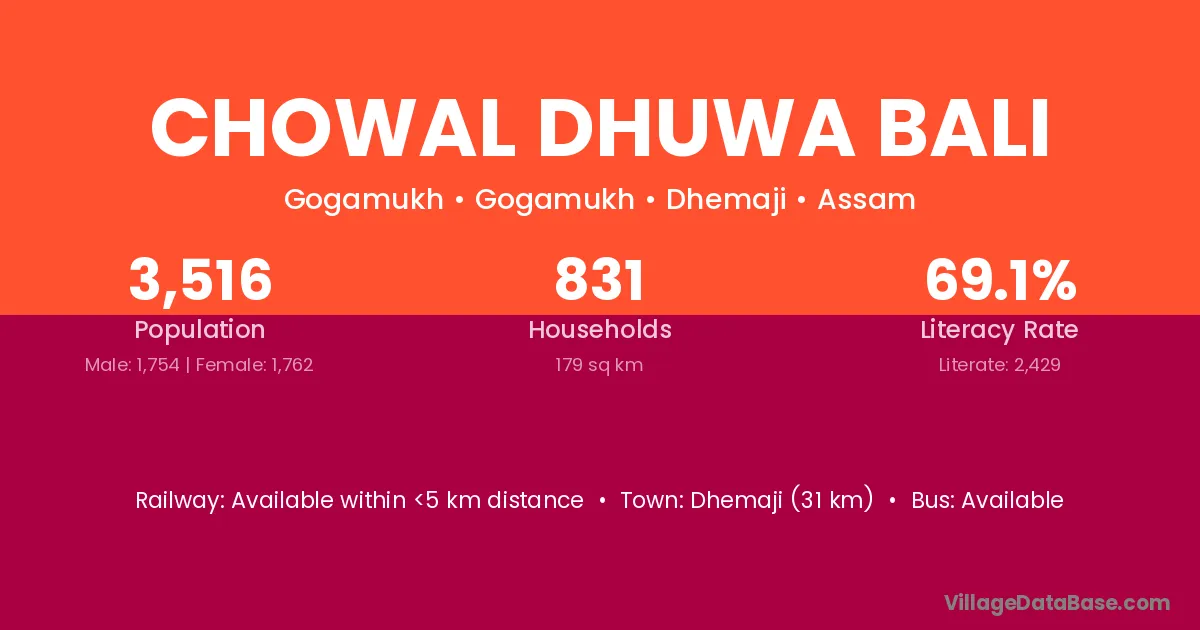 Dhemaji (31 km) is the nearest town to Chowal Dhuwa Bali village for major economic activities and is located approximately 31 km away.