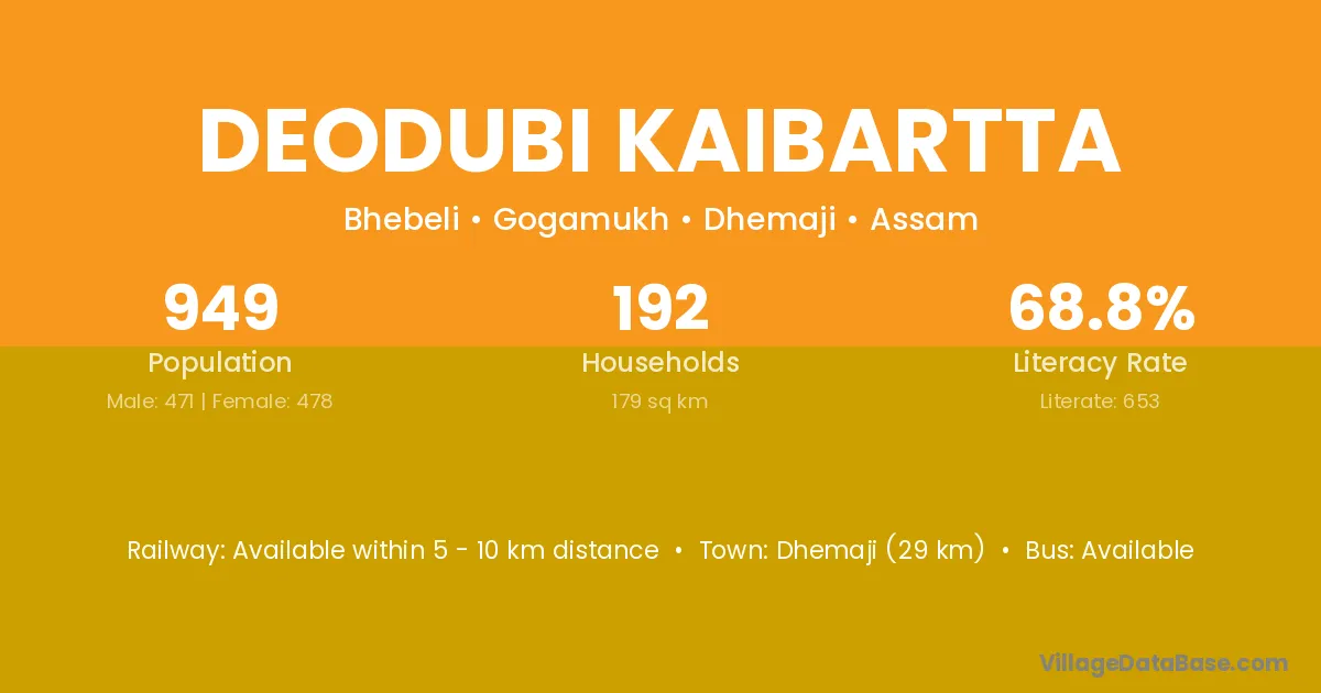 Dhemaji (29 km) is the nearest town to Deodubi Kaibartta village for major economic activities and is located approximately 29 km away.