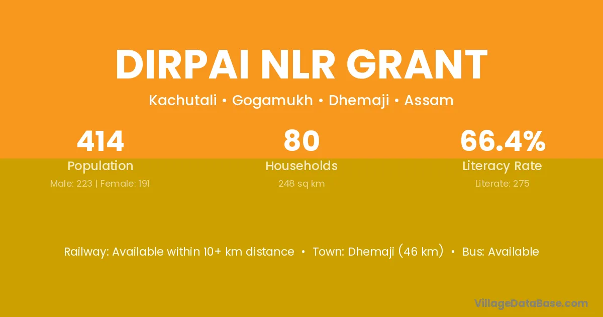 Dhemaji (46 km) is the nearest town to Dirpai Nlr Grant village for major economic activities and is located approximately 46 km away.