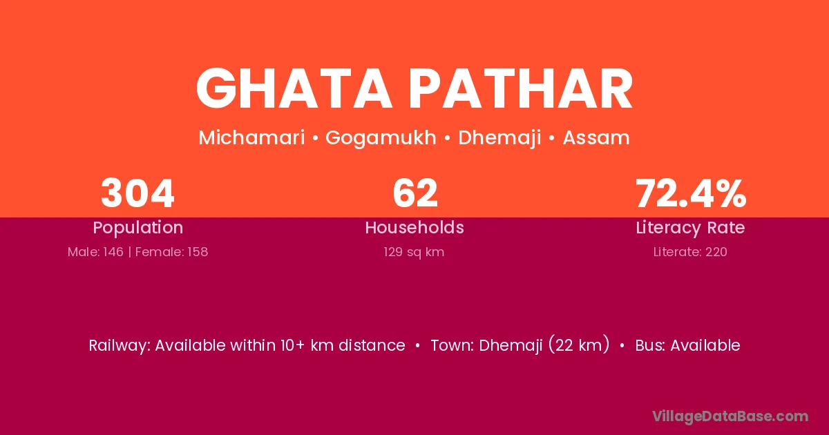 Dhemaji (22 km) is the nearest town to Ghata Pathar village for major economic activities and is located approximately 22 km away.