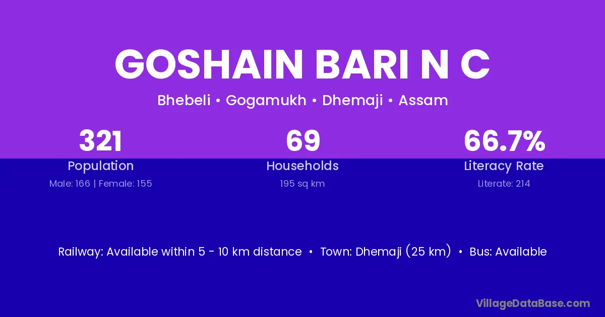 Dhemaji (25 km) is the nearest town to Goshain Bari N C village for major economic activities and is located approximately 25 km away.