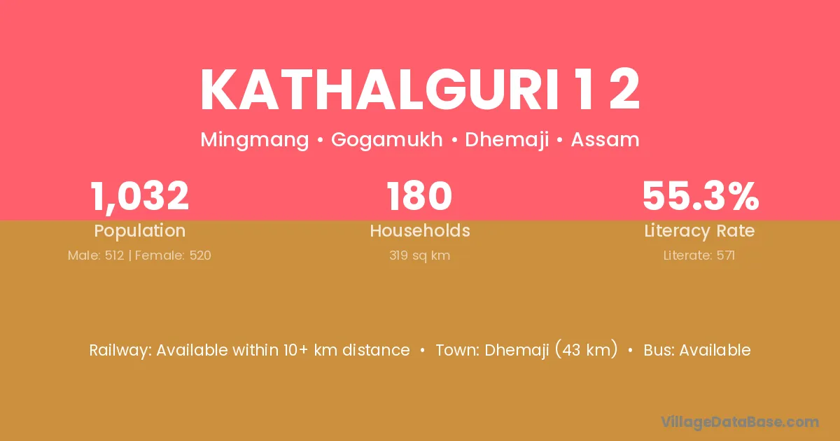 Kathalguri 1 2 village has a total population of 1,032 people, of which 512 are males and 520 are females.