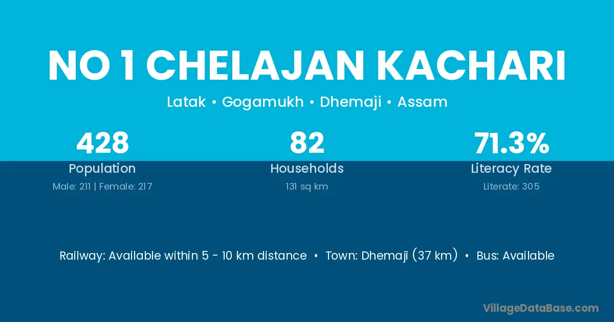 No 1 Chelajan Kachari village has a total population of 428 people, of which 211 are males and 217 are females.