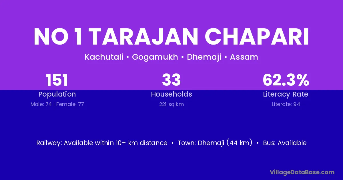 Dhemaji (44 km) is the nearest town to No 1 Tarajan Chapari village for major economic activities and is located approximately 44 km away.