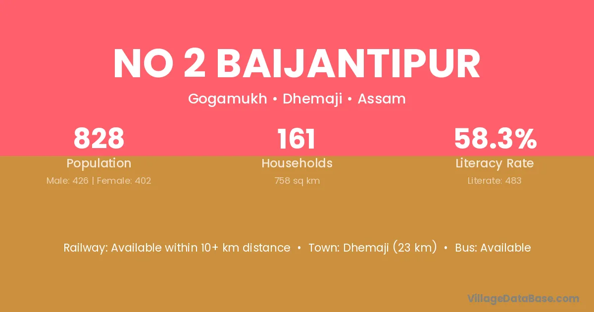 Dhemaji (23 km) is the nearest town to No 2 Baijantipur village for major economic activities and is located approximately 23 km away.