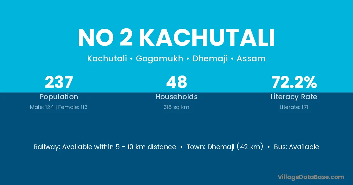 Dhemaji (42 km) is the nearest town to No 2 Kachutali village for major economic activities and is located approximately 42 km away.