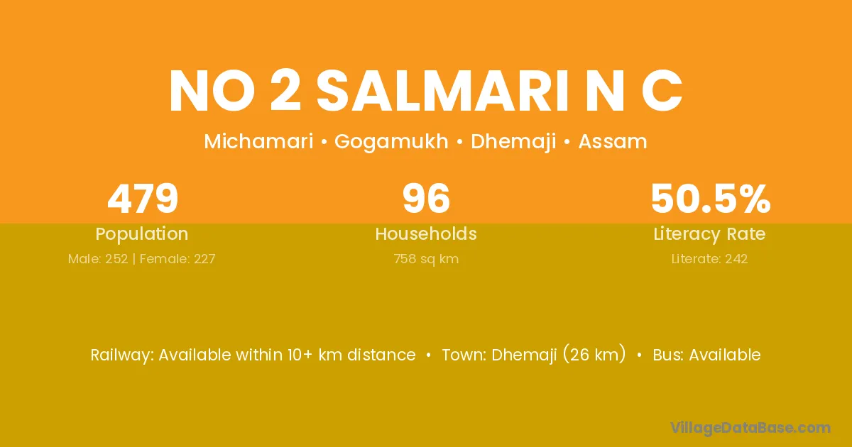 No 2 Salmari N C village has a total population of 479 people, of which 252 are males and 227 are females.