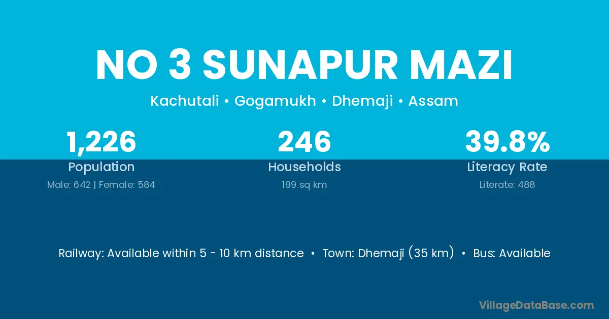 Dhemaji (35 km) is the nearest town to No 3 Sunapur Mazi village for major economic activities and is located approximately 35 km away.