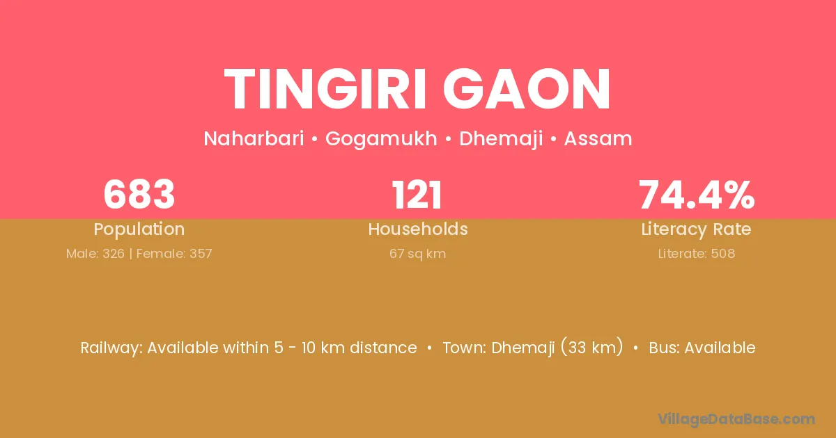 Tingiri Gaon village has a total population of 683 people, of which 326 are males and 357 are females.