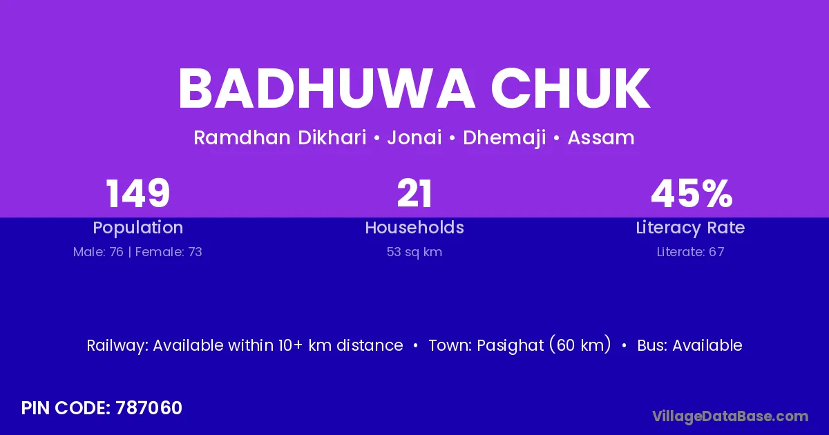 Pasighat (60 km) is the nearest town to Badhuwa Chuk village for major economic activities and is located approximately 60 km away.