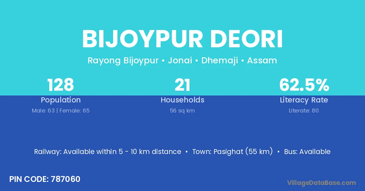Bijoypur Deori village has a total population of 128 people, of which 63 are males and 65 are females.